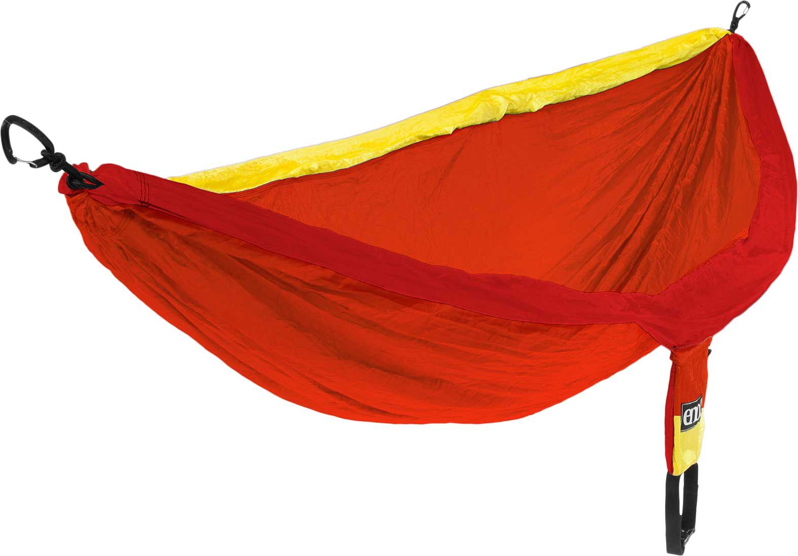 Sneak away and unwind beneath the trees in the ENO® DoubleNest Hammock. This outdoor hammock offers unparalleled relaxation for one but is roomy enough for two. Easily fold it up into the compression stuff sack for storage or transport. Made of breathable and quick-drying nylon, the DoubleNest Hammock is comfortable and strong enough to hold 400 lbs. Set it up anywhere in the great outdoors with the aluminum wiregate carabiners. FEATURES: DoubleNest Hammock Perfect for lounging in your backyard or at the campsite Ideal for car camping and backpacking Offers complete relaxation for 1 to 2 people Heavy-duty triple stitched seams Breathable, quick drying nylon Durable aluminum wiregate carabiners Attached compression stuff sack for storage and packing Atlas hammock straps are sold separately SPECS: Weight Capacity: 400 lbs. Hammock Weight: 19 oz. Material: 70-Denier High Tenacity Nylon Taffeta Folded Dimensions: 5” L x 5” W Unfolded Dimensions: 9’4” L x 6’2”